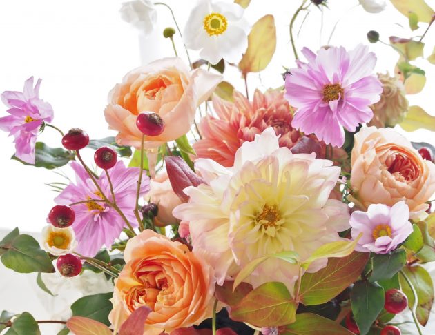 2種類のダリアを3本使いましたが、淡いピンク・イエローの「ムーンワルツ」が2本ですと可愛い感じに、オレンジ系の「アンティークロマン」が2本ですとシックな感じになりました。