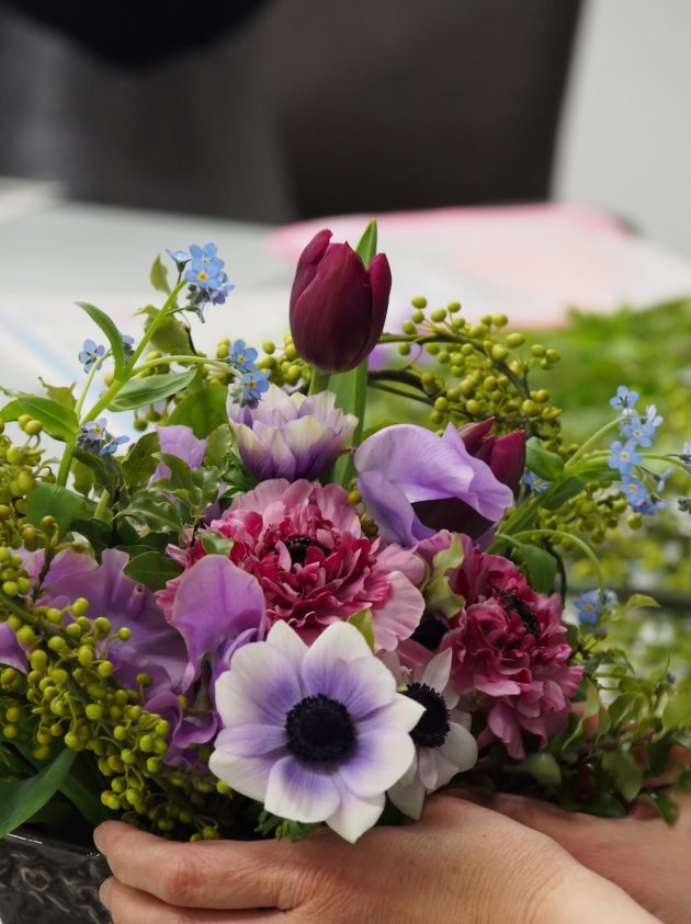 色がのっていてとても綺麗だったラナンキュラスのシャルロットとアネモネのポルト、チューリップのマルガリータと、ピンクと紫のロマンティックな色合いにしました。