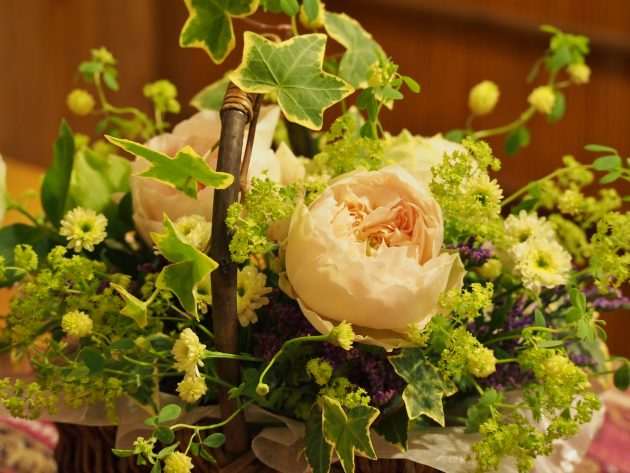 仕入れる日によって花材が少し変わりますが、素敵な香りのバラに加え八重咲きのクリスマスローズを使い、ロマンティックな感じになりました。