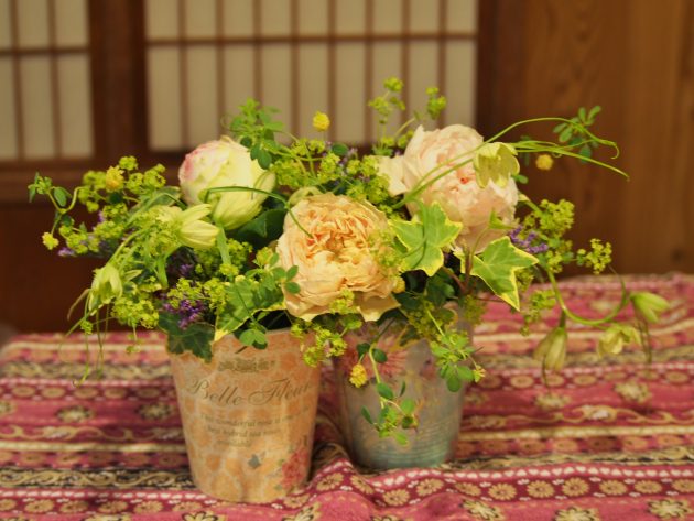 カゴが足りなくなってしまったので、お花に合わせた器もご用意しました。