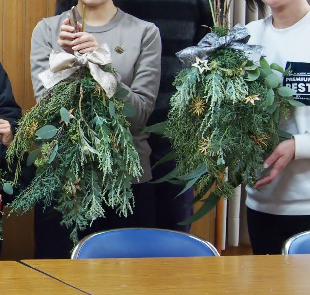 2年前からお正月アレンジの出張講座をさせていただいておりますが、今年はクリスマスアレンジのご依頼もいただきました。どちらかを選んでいただけるようにしましたが、どちらも作られた方も!
