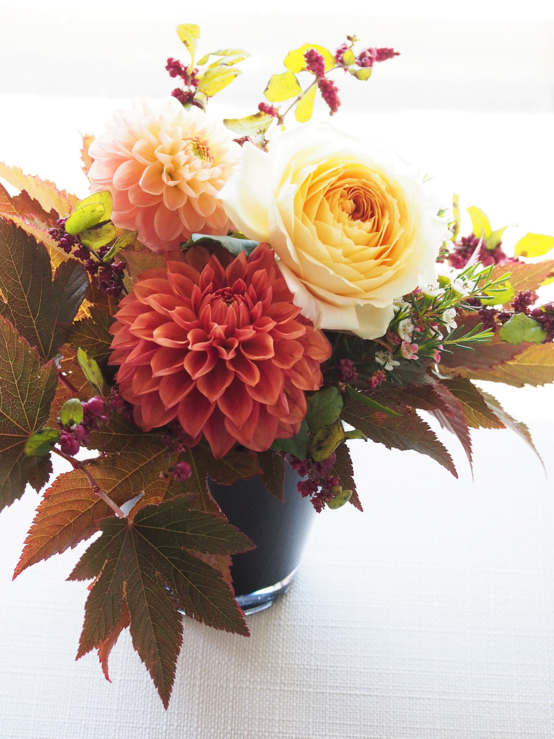 大きなお花が4輪なので、配置が四角にならないようにねとアドバイスさせていただきました。
