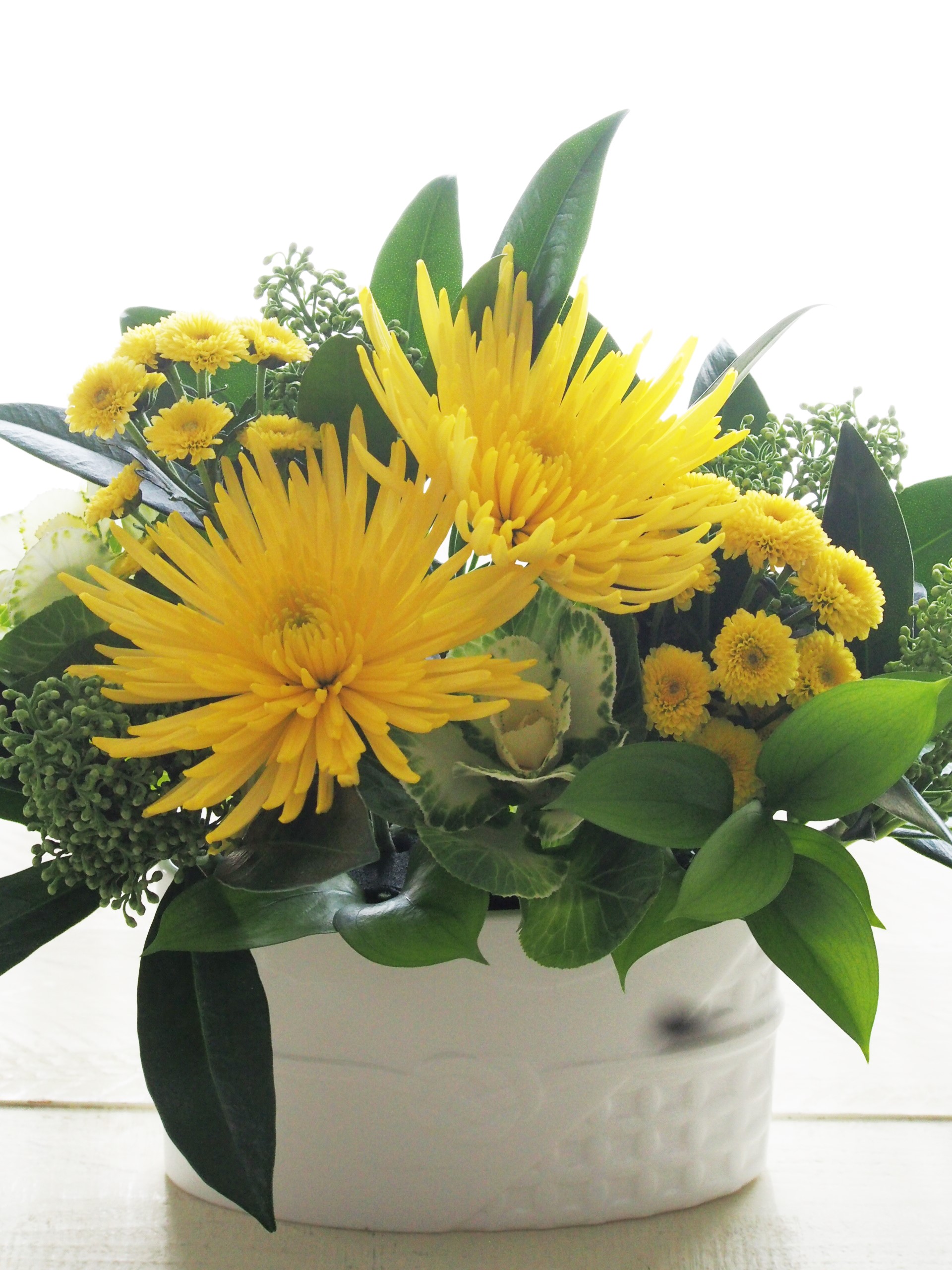 年の初めのレッスンは、ミモザを使ってイエロー、ホワイト、の明るい色調のアレンジにしようと思っていましたが、ミモザが入らなかったので、代わり...