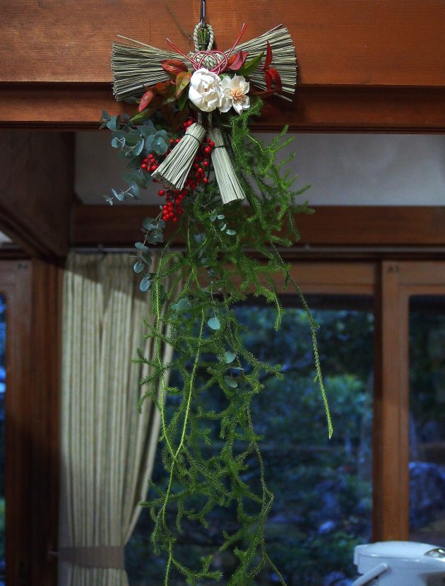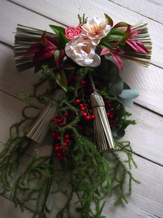縁起のよい植物とされているヒカゲノカズラを主役に、主催者から香りのよい植物を入れてほしいというリクエストに応えてユーカリをプラスしました。リボンのような形のしめ飾りにソーラーフラワーを付けて少し可愛らしいデザインを考えました。