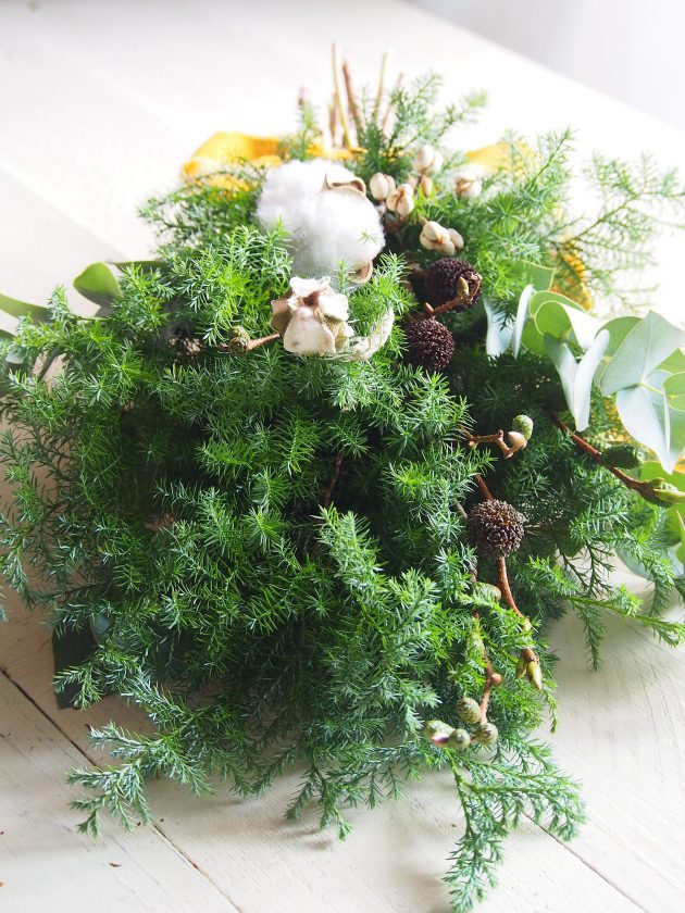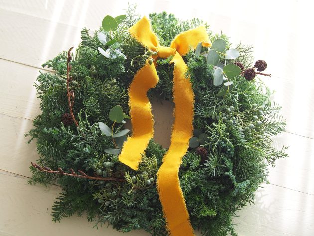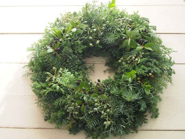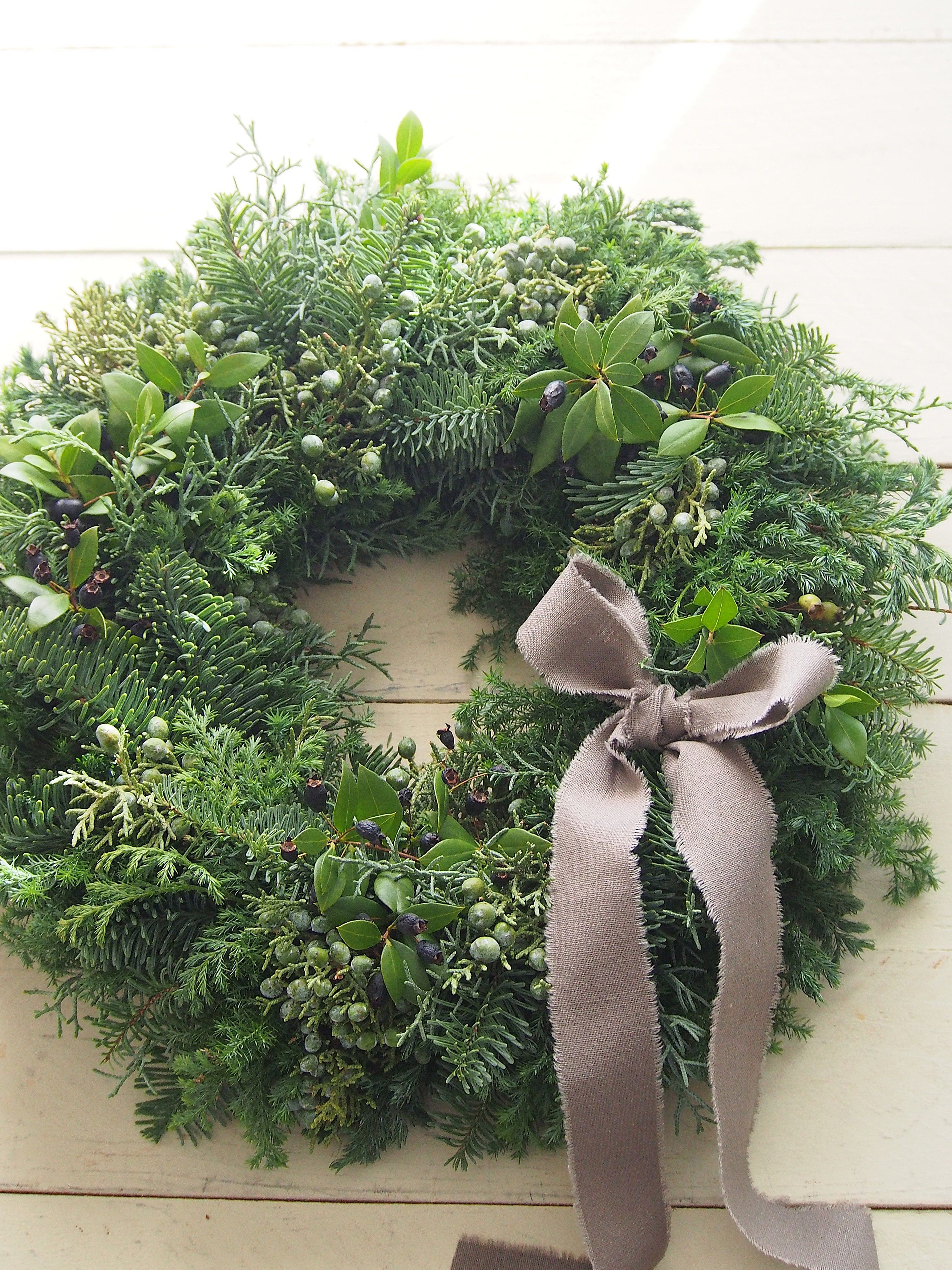 リースはいつものシベリアモミ、ヒムロスギ、ブルーアイス、ブルーバードにジュニパー。ジュニパーの実付がとてもよく、色もグリーンの瑞々しい状態のものが入荷しました。(過去一かも)ジュニパーをいっぱい使ったシンプルなエバーグリーンのリースですが、私はこれが一番好きです。