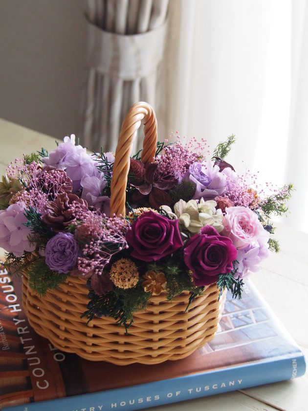 プリザーブドフラワーのレッスンも行いました。バスケットの縁にだけ飾りつけています。