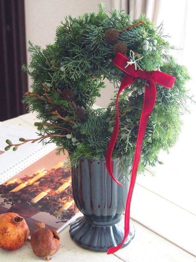 11月のアレンジレッスンでも使ったマートルを加えて、シンプルですが上品なリースになりました。