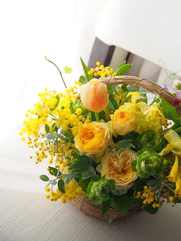 希望に満ちあふれた明るいトーンのアレンジにしたいなと思いイエローのお花を集めました。