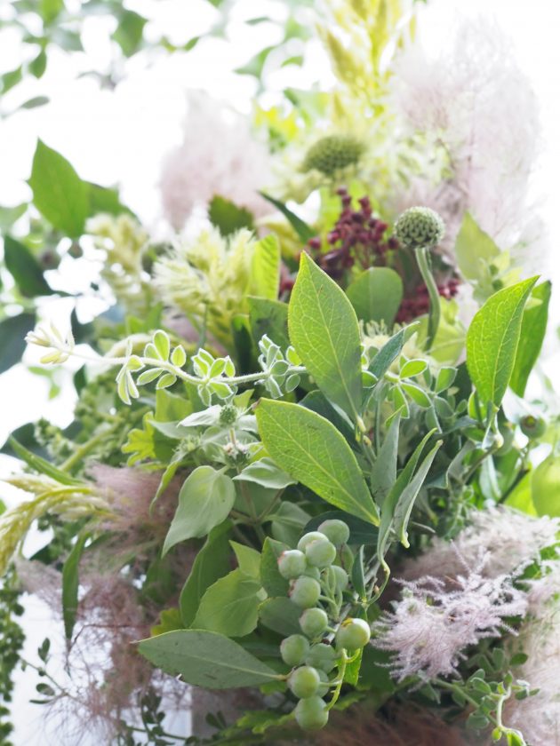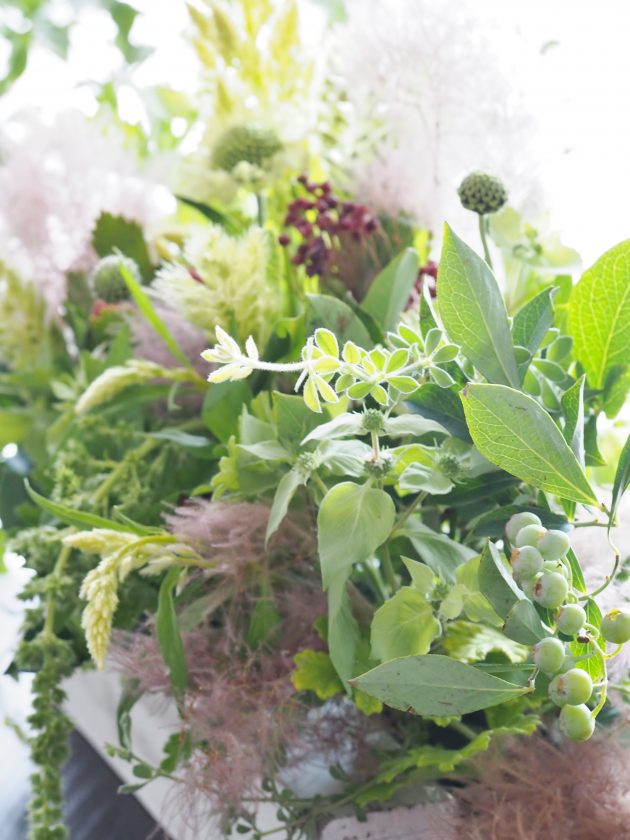 今年は6月から猛暑日が続いていたので、なるべく長く持ちそうな様々なグリーンを選んで、ボタニカルガーデンをイメージしたアレンジをつくっていただきました。